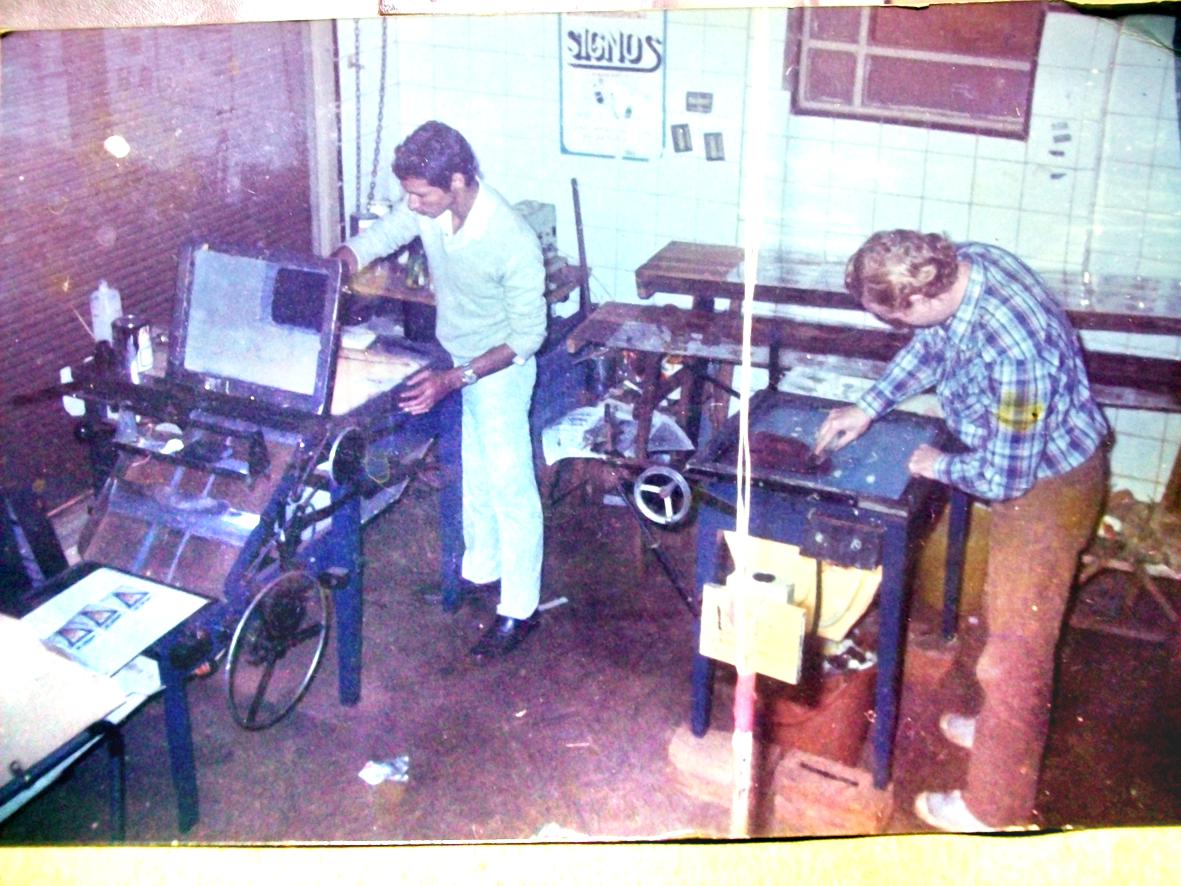 No obstante se había quedado con un bastidor de seda (que se usa en serigrafía); una espátula y algunos otros elementos. En un balcón del departamento familiar en el barrio Yerbal Viejo, cerrado improvisadamente, con lo que tuvo al alcance construyó dos máquinas y retornó a la serigrafía. La primera fue una impresora a la que luego le agregó un contador automático fabricado a partir de una calculadora normal modificada por él mismo y una aspiradora con platina de absorción también de fabricación casera. La otra máquina fue una insoladora que transfería el diseño del original negativo mediante luz de alta potencia al bastidor de impresión. A éste último luego le agregó un temporizador automático. Ambas fueron hechas con restos de viejas fotocopiadoras heliográficas.