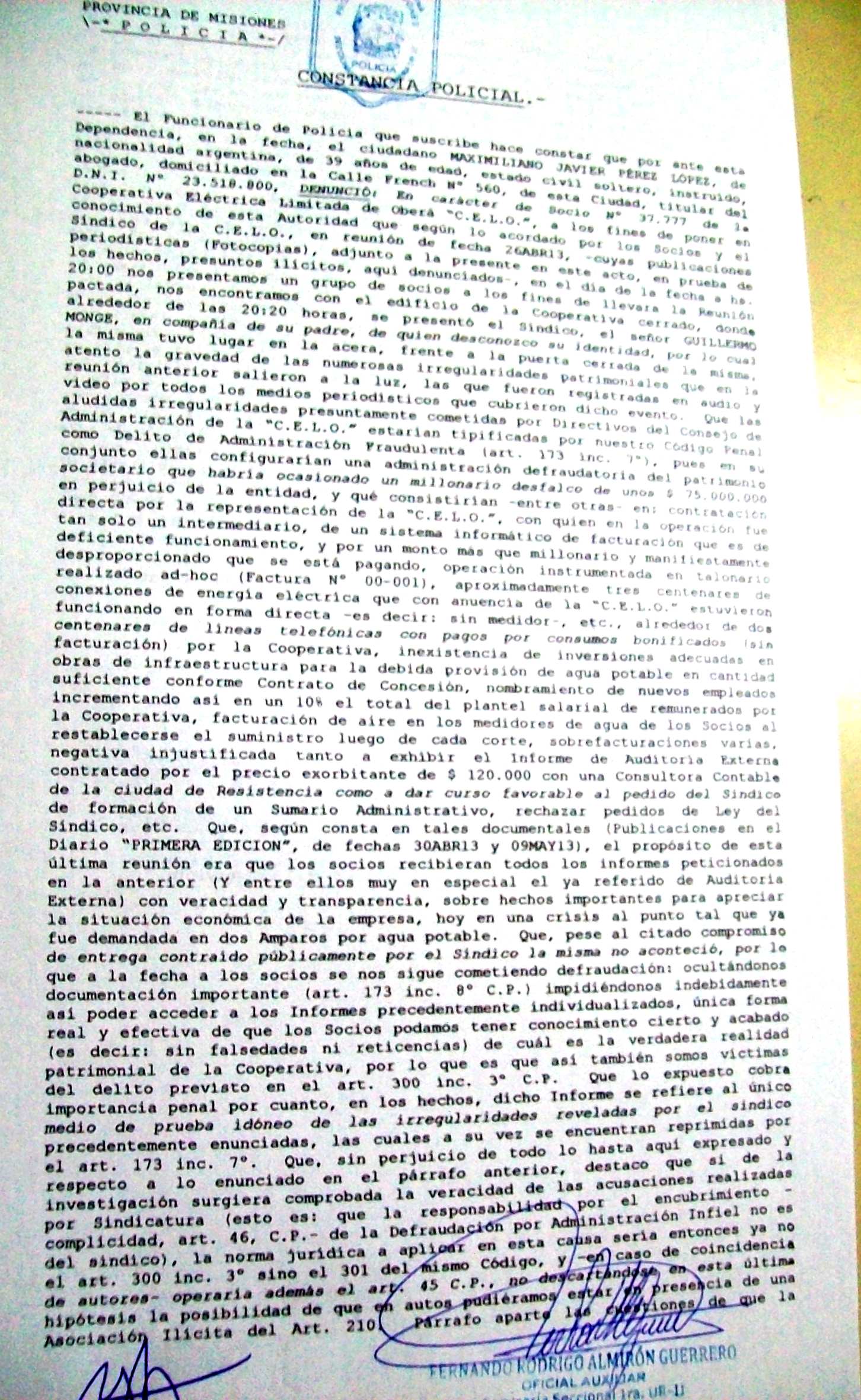 Por otro lado, Ramón Escobar y el abogado Pérez López propusieron radicar una denuncia penal por las irregularidades en la administración que derivaron en los 75 millones de deuda que se dio a conocer públicamente. Esto último se concretó una hora después en la Secciona Primera de Oberá, quedando el abogado Maximiliano Pérez López como denunciante. El objetivo del mismo, según lo explicó López, es que tanto el fiscal como el juez comiencen a moverse pidiendo información e investigando el porqué del desastre económico dentro de la CELO.