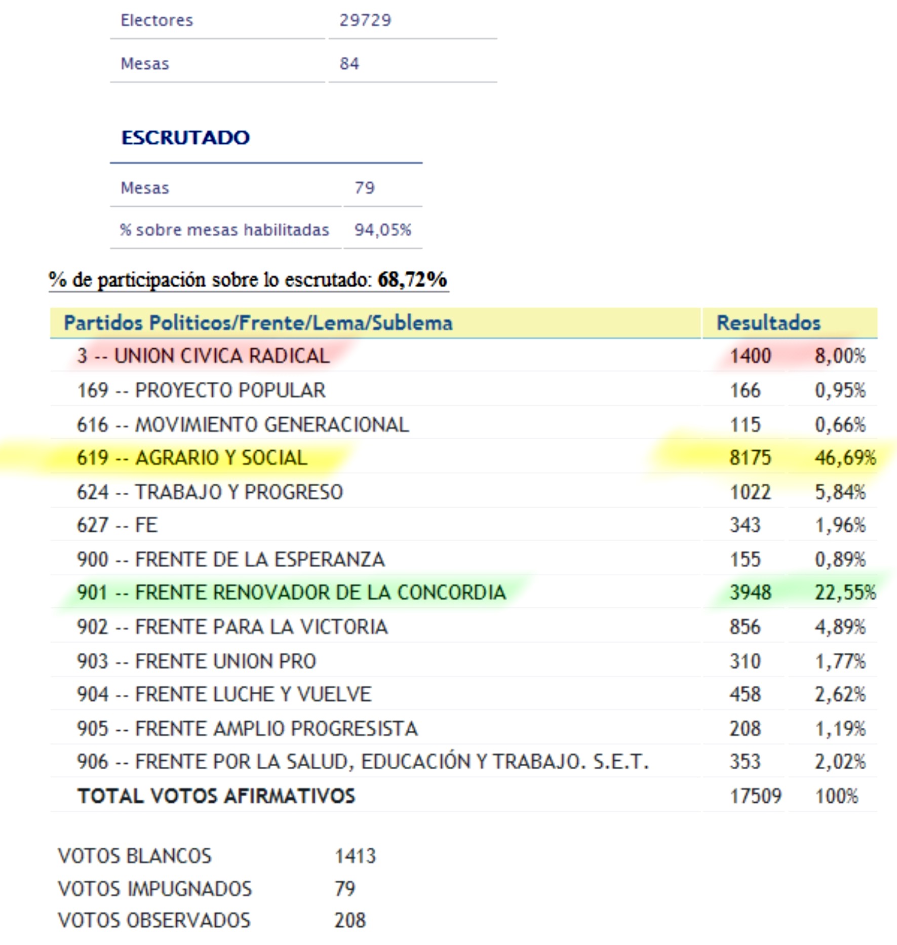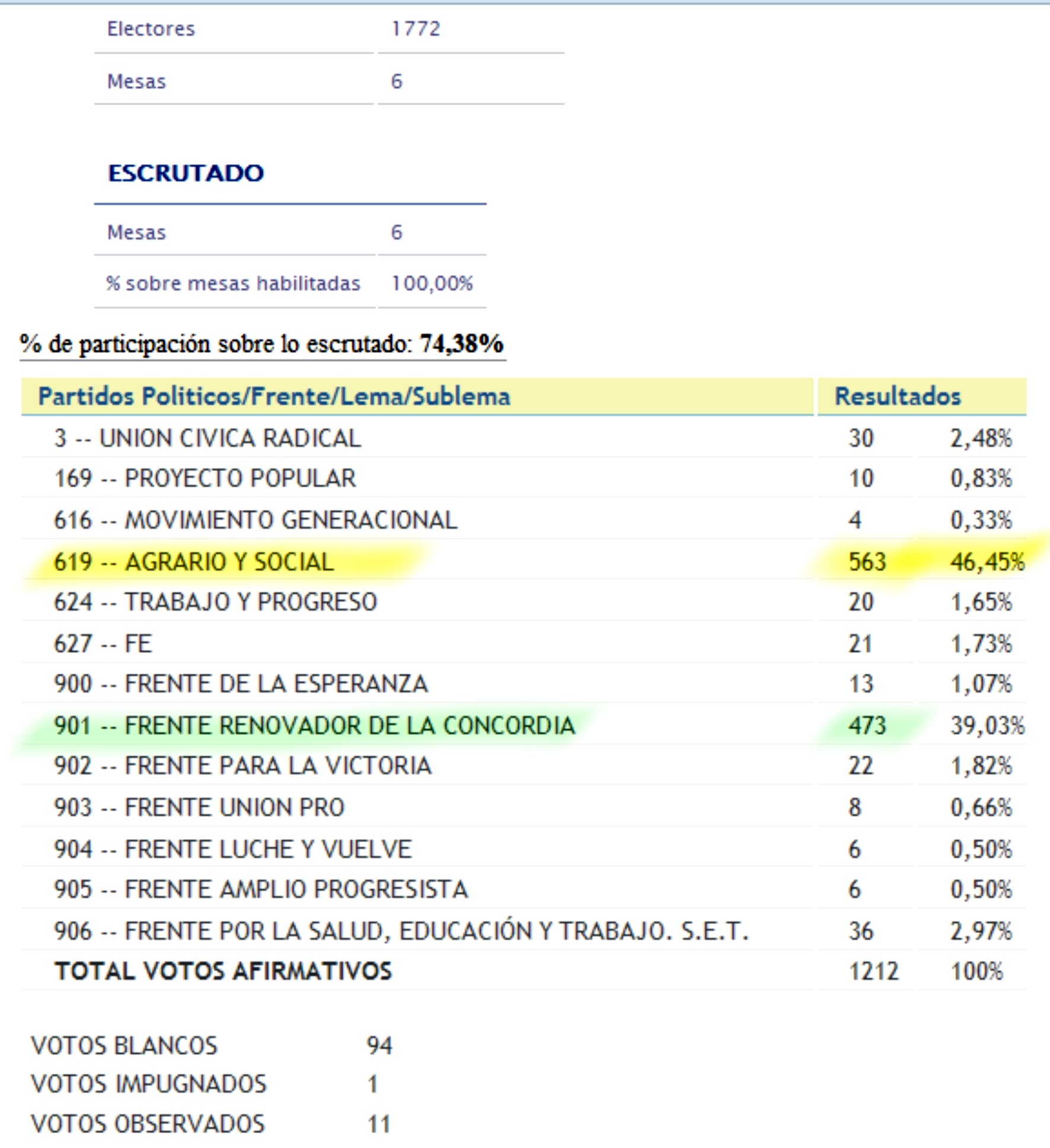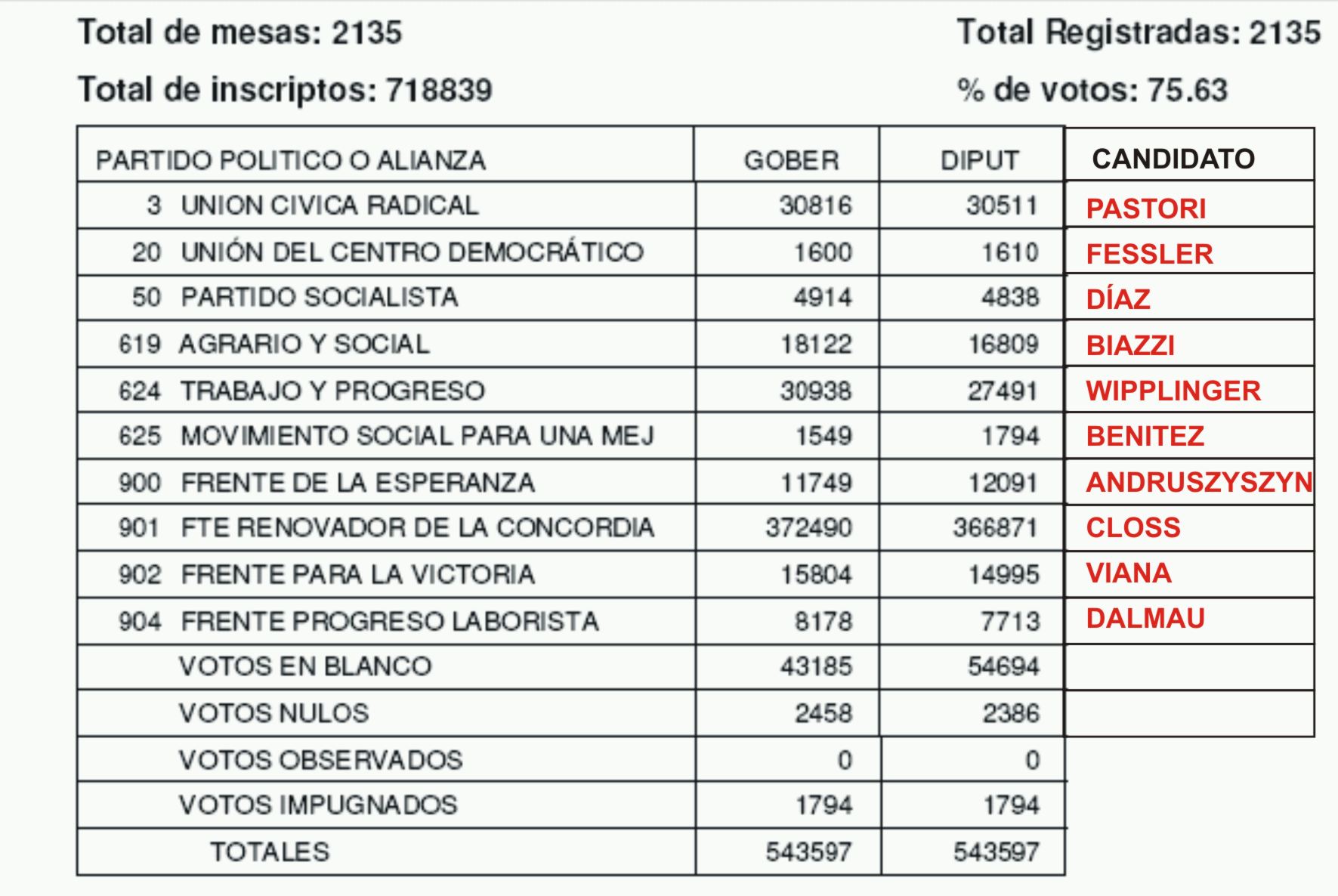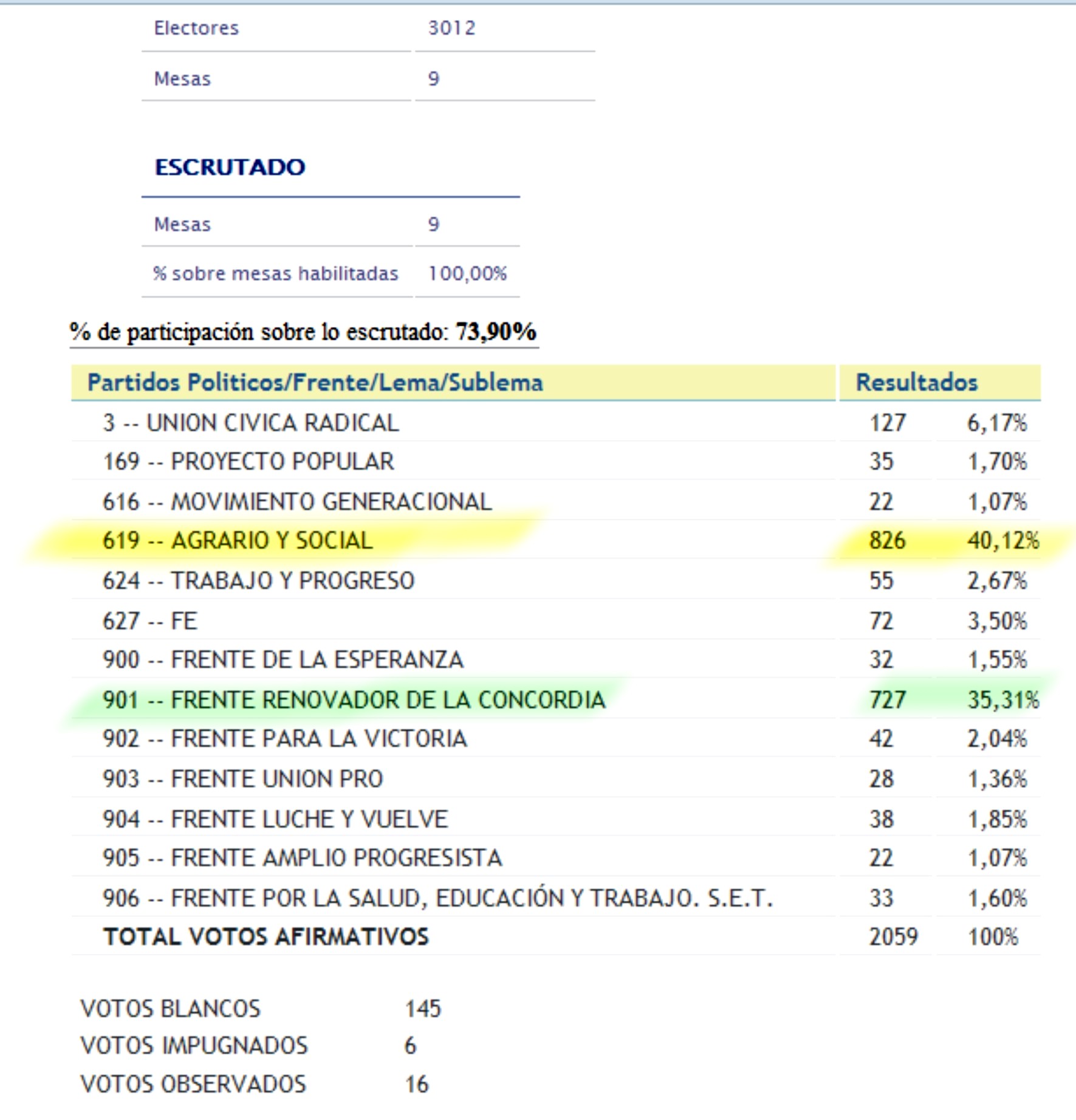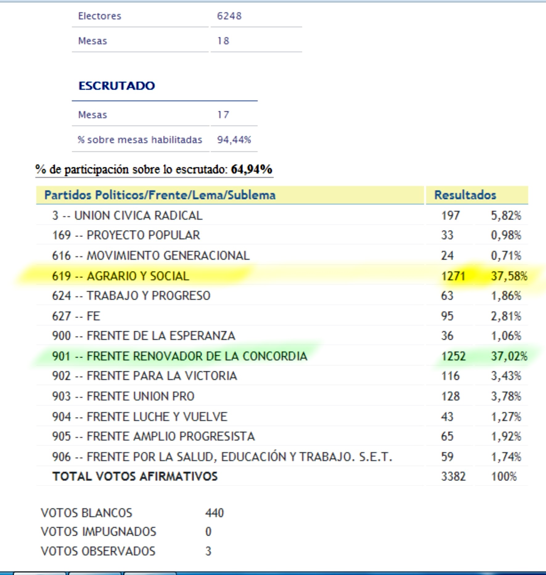 En Garupá, la Renovación se impuso con el 33 %, pero fue uno de los pocos lugares donde Unión Pro le ganó a la UCR. 1251 a 1231 votos.