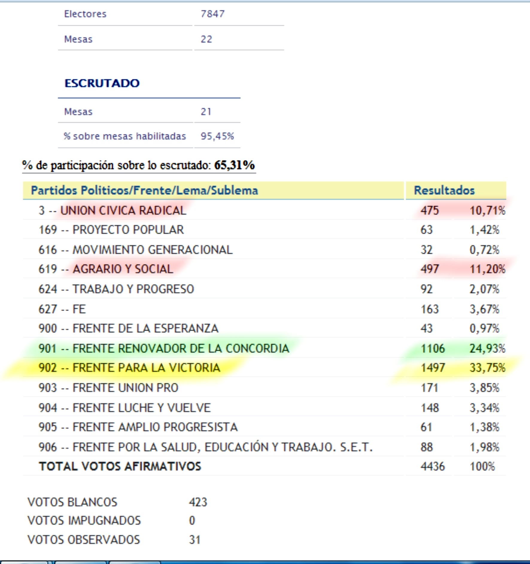 El Frente para la Victoria, (de Cristina Kirchner) tuvo una pésima elección, ganando solo en Campo Viera y Almafuerte, de donde es oriundo DARIO PIETROWSKI, cabeza de esa lista, que es intendente de esa pequeña localidad desde hace 22 años (1995 – 2013).