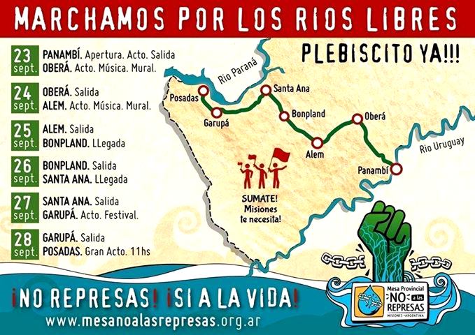 Con las consignas de Si a la Vida, Libertad a los Ríos, No a las Represas, la Marcha recorrerá más de 150 kilómetros, con salida desde puerto Panambí a las 9 horas por la ruta 5, pasando por las avenidas de Oberá hasta el Centro Cívico donde se realizará una concentración en horarios de la tarde, luego se partirá hacia L. N. Alem el día martes, hacia Bompland el día miércoles por la ruta 4; el jueves por la ruta 103 hasta Santa Ana; el viernes por la Ruta 12 hasta Garupá, y la llegada a Posadas el día sábado 28.