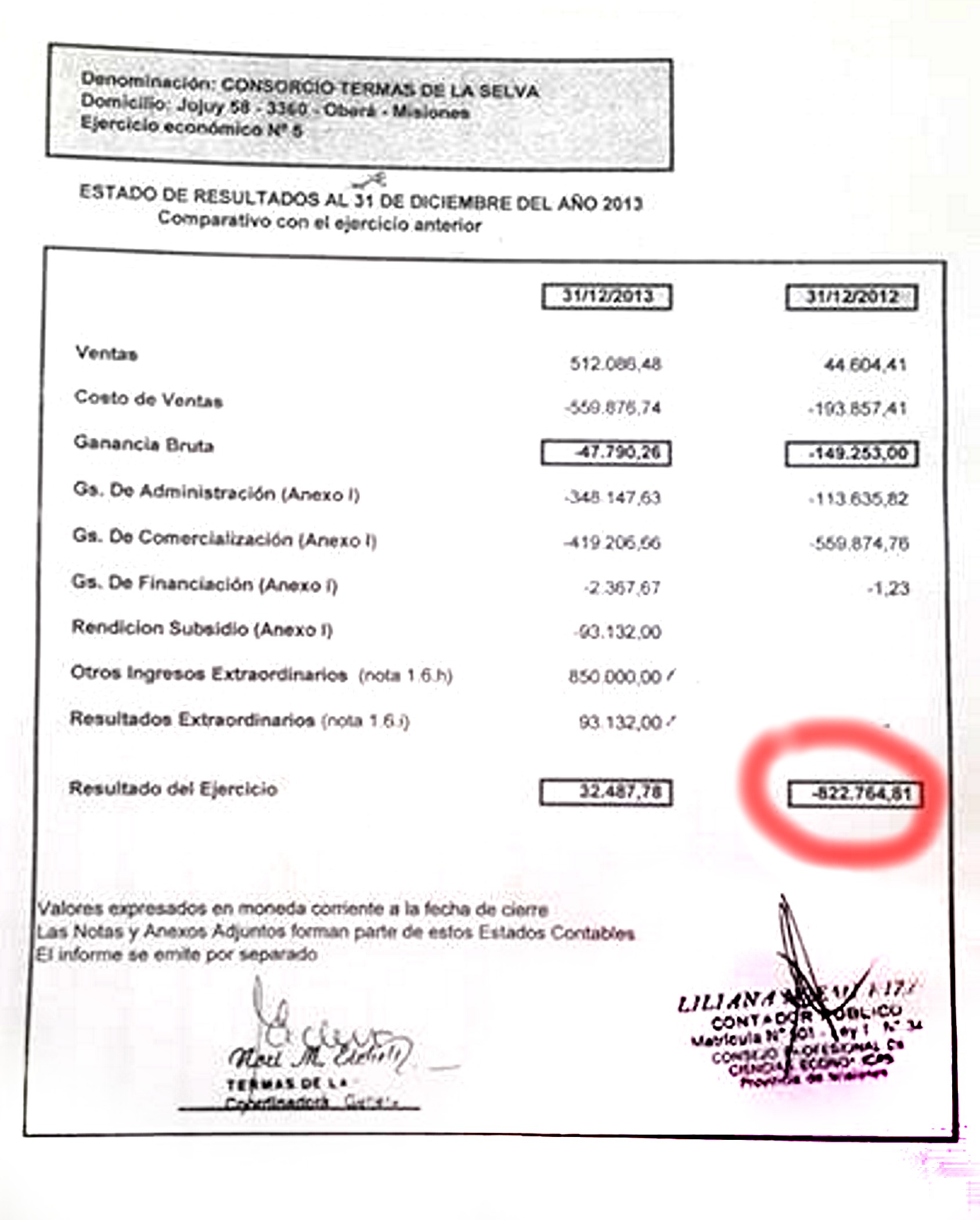 a.-Balance 2012, perdidas por la suma de -$ 822.764,81