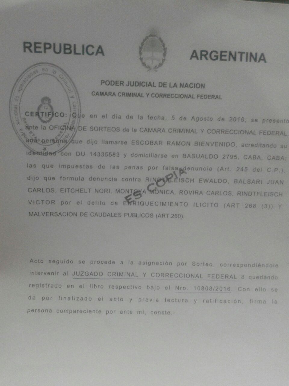 Escobar reforzó la denuncia en el fuero Federal de Comodoro Py y tras el sorteo le corresponde al juzgado Federal 8, a cargo del Dr. Marcelo Martínez Di Giorgi.