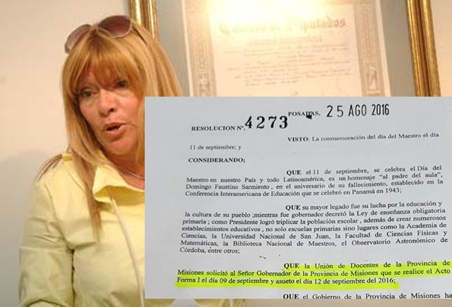 POSADAS. Desde las agrupaciones sindicales misioneras no pudieron evitar la suspicacia respecto al decreto del Gobernador de la provincia Hugo Passalacqua, que dispuso asueto escolar para el día 12 de septiembre, con el motivo de celebrarse el día del maestro, que cae un día antes, es decir fin de semana. Esto fue por pedido del gremio oficialista UDPM cuya secretaria adjunta es Stella Maris Raquel Leverberg, quien casualmente cumpleaños ese día lunes, y se pidió que el acto por recordando el aniversario del fallecimiento de Domingo Faustino Sarmiento “padre del aula Argentina”sea el 9 de septiembre.