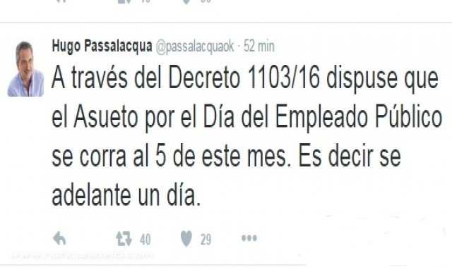 POSADAS. A través del Decreto 1103/16 el gobernador Hugo Passalacqua dispuso que el Asueto por el Día del Empleado Público se corra al lunes 5 de este mes. «Es decir se adelante un día. Por lo tanto este año, el 5 será el día para celebrar a nuestros trabajadores de la Administración Pública. El 6 será día laborable normalmente», afirmó. Aprovechó para mandar «un cálido saludo a los que, con su esfuerzo cotidiano, comparten la tarea de estar al servicio de la gente».