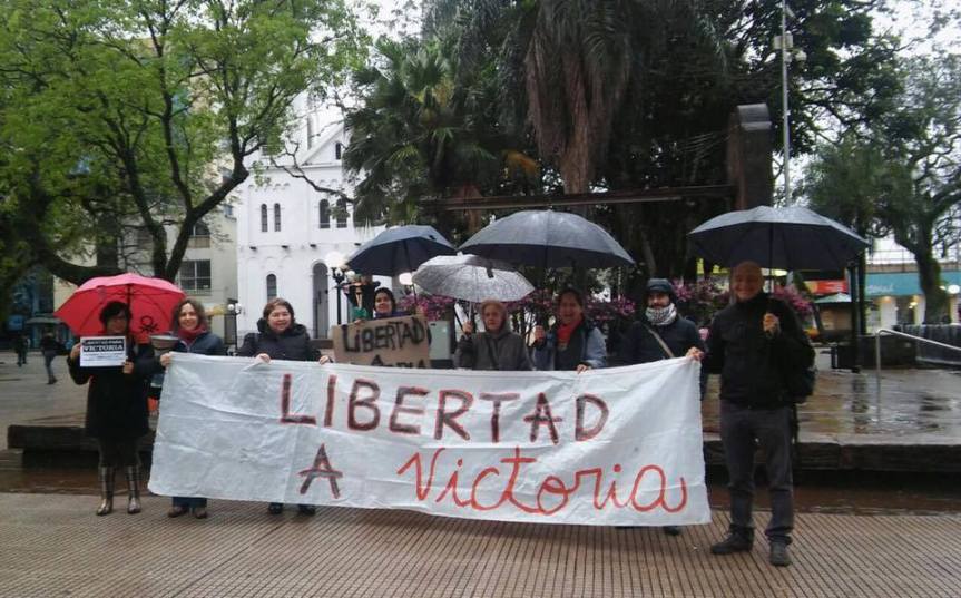 POSADAS. El lunes, pese al mal tiempo y paralelamente a la marcha realizada en Oberá, integrantes del Movimiento de Mujeres «Cecilia Rodriguez» estuvieron en la plaza 9 de Julio de la capital provincial pidiendo por la Libertad de Victoria Aguirre.
