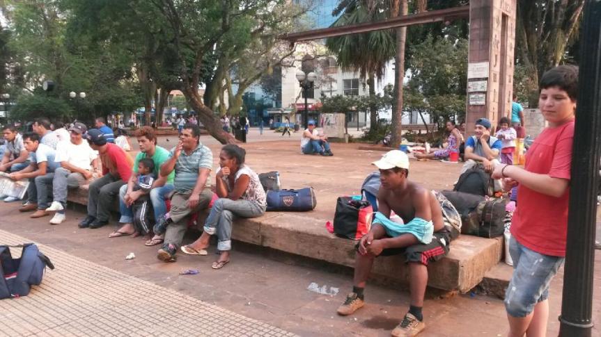 POSADAS Y OBERA. Unos 60 tareferos de la zona centro de Misiones, que la semana pasada acamparon en la rotonda frente al Parque de las Naciones, llegaron este ayer hasta la plaza 9 de Julio de Posadas para reclamar por un aumento del subsidio interzafra y de la tarjeta social, ya que sostienen que no les alcanza para cubrir la canasta básica de alimentos.