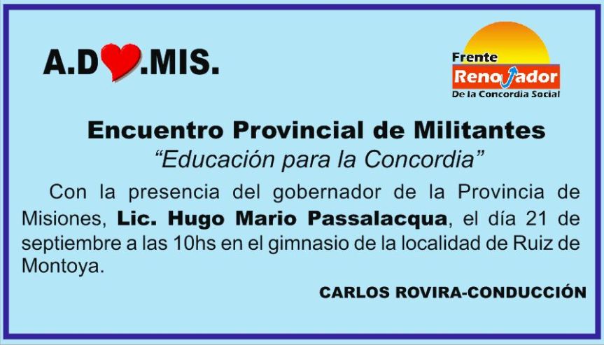 OBERA. El gremio oficialista UDPM – ADOMIS cuya secretaria General es la ex diputada obereña Stella Maris Leverberg convocó a un «Encuentro Provincial de Militantes» bajo el título de «Educación para la Concordia», destacando que estará presente el gobernador Hugo Passalacqua. Esto se desarrollará en la pequeña localidad de Ruiz de Montoya, cerca de Puerto Rico. Infatablemente, posee el escudo del partido gobernante y abajo reza «Rovira Conducción».
