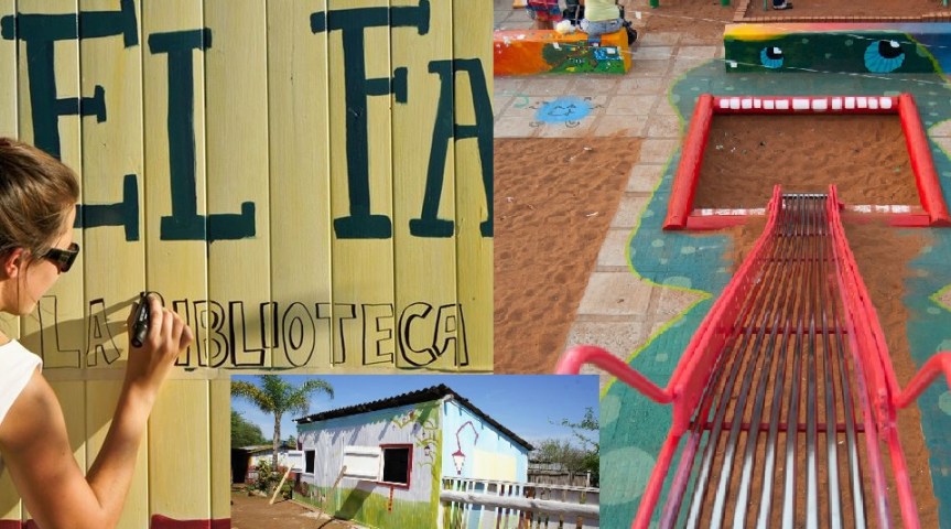 La joven artística obereña relató que, en 2012, a su regreso de París (Francia) donde vivió un año, conformó «Pintaplazas»… «La idea original era generar un grupo de voluntarios para pintar y arreglar las plazas de la ciudad… plazas de escuelas, de barrios, patios de hospitales, etc». Ese año, por una iniciativa del Club de Leones pintaron y decoraron el sector de juegos de la plazoleta céntrica conocida como «Leoncito» sobre la avenida Libertad…»pintamos la plaza por iniciativa y gestión del Club de Leones, luego nos llamaron los chicos de TECHO para ayudarlos a pintar una vivienda de emergencia modelo, para usarla como stand. La pintamos en conjunto. Nosotras preparábamos los colores y dirigíamos la obra, y los voluntarios de techo nos ayudaban a pintarla».