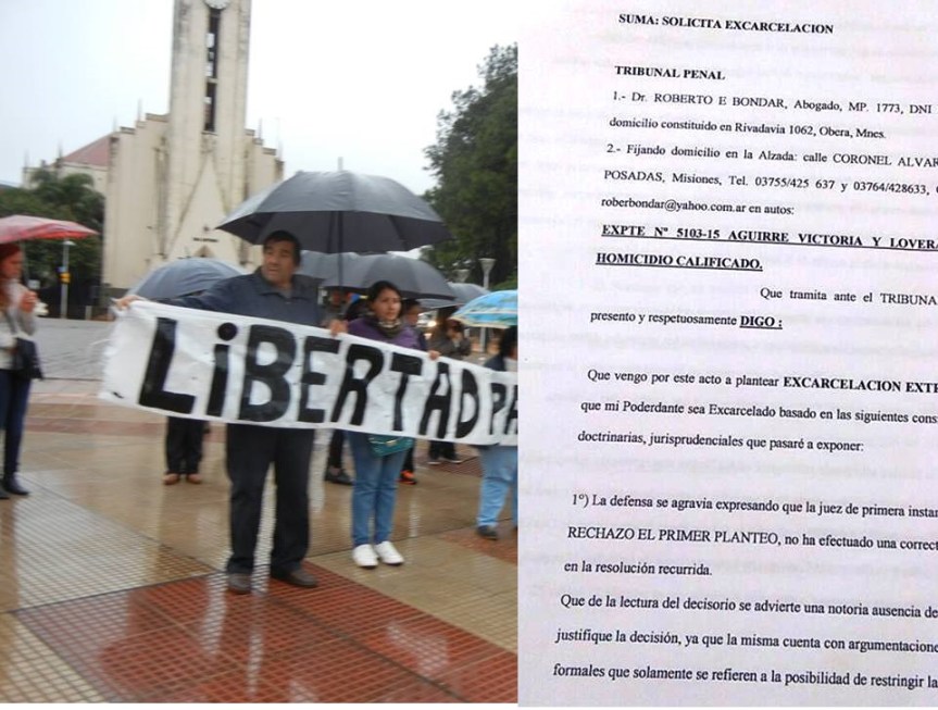 El abogado Roberto Bondar realizó una «petición de excarcelación extraordinaria» ante el Tribunal Penal Uno de esta ciudad argumentando de que «la defensa agravia diciendo que la juez de primera instancia , quien rechazó el primer planteo, no ha efectuado una correcta fundamentación en la resolución recurrida, y que se advierte una notoria ausencia de motivos que justifiquen la decisión».En las argumentaciones Bondar asegura que el juzgado no explica por qué no tiene elementos para liberar a Aguirre mientras espera el juicio, y de que manera podría entorpecer la investigación.