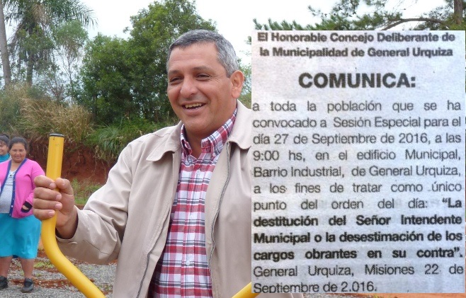 Varias irregularidades. Enríquez asumió la comuna de General Urquiza en 2011 y fue reelecto en 2015. Desde entonces, recibió sólo en concepto de coparticipación, unos 22 millones de pesos destinados al funcionamiento municipal, dentro de los que están los pagos de sueldos: en ese sentido, el monto actual de sueldos por todo concepto que requiere el municipio para funcionar asciende a unos 250 mil pesos mensuales. Sobre el intendente pesan denuncias por cheques sin fondos que fueron librados a través del Banco Nación (según informó la propia entidad) u otros a través del banco Macro (según denuncias penales de afectados) y por obras que figuran como ejecutadas pero que sin embargo los concejales constataron con un escribano público que no fueron realizadas, como puentes, entoscado, o cerramientos y reparaciones del viejo edificio municipal, entre otras. Esas irregularidades llevaron a los concejales a conformar la Comisión Investigadora que concluyó en los seis cargos mencionados, que fueron rechazados por el abogado del intendente Enríquez. De todas maneras y en medio de este contexto, el Concejo Deliberante de General Urquiza publicó el 22 de septiembre el edicto en diarios de Misiones donde comunican a la población que convocaron a Sesión Especial para el día 27 de septiembre de 2016, a las 9 horas, en el edificio Municipal del barrio Industrial de General Urquiza, “a los fines de tratar como único punto de la Orden del Día la destitución del señor Intendente Municipal o la desestimación de los cargos obrantes en su contra”. (MisionesCuatro)
