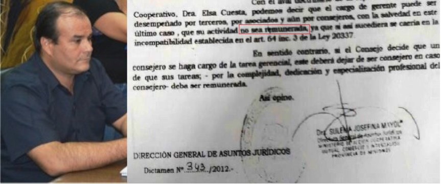 Con fecha del 6 de julio de 2012, la dirección de Asuntos Jurídicos, dictamen 343/2012, con el aval de la especialista en Derecho Cooperativo Dra. Elsa Cuesta dice claramente que el cargo de gerente puede ser desempeñado por terceros, por asociados y aún por consejeros con la salvedad en este último caso que su actividad no sea remunerada, ya que si así fuera caería en la incompatibilidad establecida en el artículo 64 de la Ley 20337.