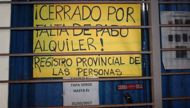 CAMPO GRANDE. Por una deuda de alquiler de 10 meses, desde diciembre del 2015 en adelante, el Registro de las Personas que funciona en esa localidad ayer se encontró con un candado en la puerta y un cartel con la leyenda de que estaba cerrado por falta de pago.