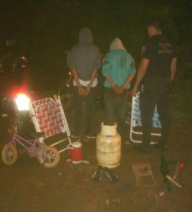 OBERA. El Comando Radioeléctrico de esta ciudad, en el marco de tareas de prevención que lleva adelante en distintos barrios de Oberá, ésta madrugada procedió a la demora de dos menores de 16 y 17 años, respectivamente y secuestró una bicicleta infantil, dos pares de zapatillas, una garrafa de 10 kilos, sillones reposeras, entre otros elementos que pertenecen a cuatro hechos en contra de la propiedad que se investigan en la seccional Segunda.