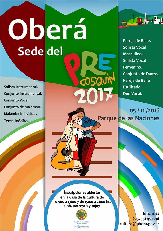 OBERA. La Municipalidad de Oberá a través del Departamento de cultura, informa que se encuentra abierta la Inscripción, hasta el día jueves 03 de noviembre, la Preselección del Certamen para Nuevos Valores del Pre Cosquín, sede Oberá, el mismo se llevará a cabo el día sábado 05 de noviembre a partir de las 15, en el escenario mayor del Parque de las Naciones.