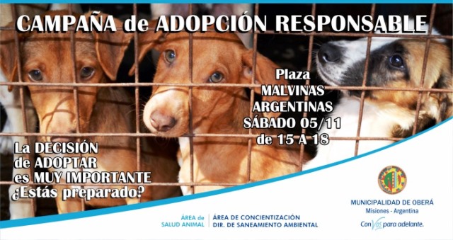 OBERA. La Municipalidad de Oberá invita a la comunidad a participar de una nueva jornada de adopción de mascotas. Será el próximo sábado 5 de noviembre de 15 a 18 en la Plaza Malvinas.
