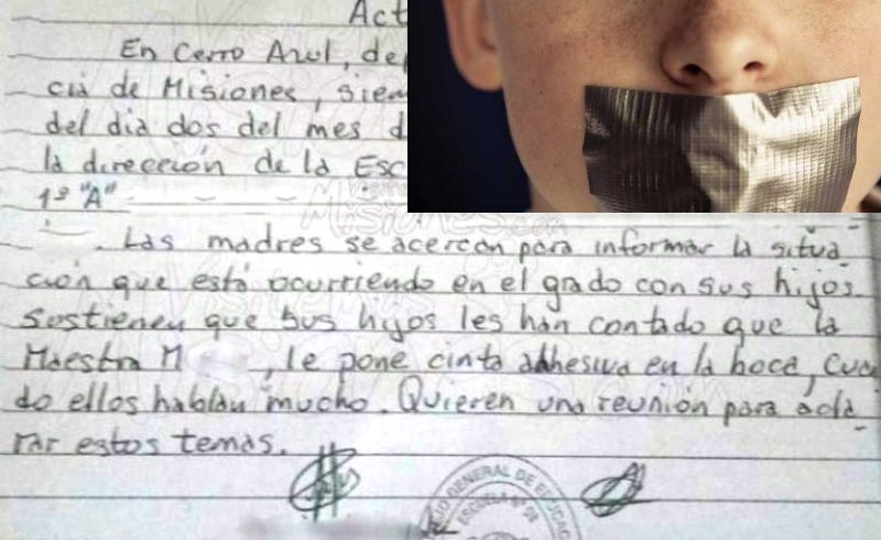 CERRO AZUL. Una maestra que lleva veinte años trabajando en una escuela de Cerro Azul tapó con cinta la boca de sus alumnos de primer grado. Se excusó a los directivos de la escuela diciendo que fue una dramatización y un juego con los niños para que aprendan a hacer silencio publicó el portal La Voz del Misiones.