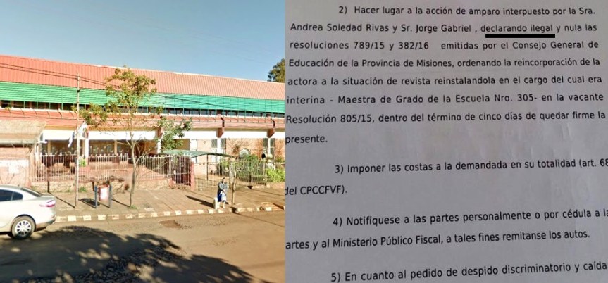OBERA. Finalmente, el Poder Judicial de la Provincia, declaró ilegal y nula las resoluciones 789/15 y 382/16 del Consejo General de Educación que movían de su cargo en la escuela 305, a la delegada gremial de UTEM-CTA, Andrea Rivas.