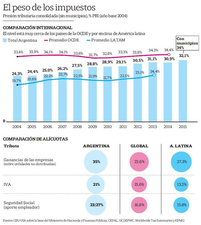 Según el Departamento de Política Tributaria de la UIA, en la Argentina la tasa de Ganancia para empresas (sobre utilidades no distribuidas) es del 35%, mientras que en América Latina es del 27%; el IVA es del 21%, contra el 13,2% promedio de la región; el aporte de las empresas a la seguridad social, de entre 23% y 27%, frente al 15,8 por ciento. En tanto, en los países vecinos no existen Ingresos Brutos ni el impuesto al cheque.