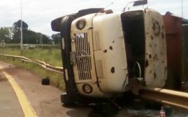 GARUPA. Sucedió en la tarde de este martes, cuando un camión Mercedes Benz 1.114, por razones que se investigan, volcó alrededor de las 14:10 en uno de los retornos de la Autovía ruta nacional 12, cerca del acceso a Garupá.