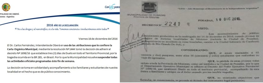 Por su parte, el intendente de Posadas, Joaquín Losada, Mediante el Decreto N° 2241/16 también declara tres días de duelo.