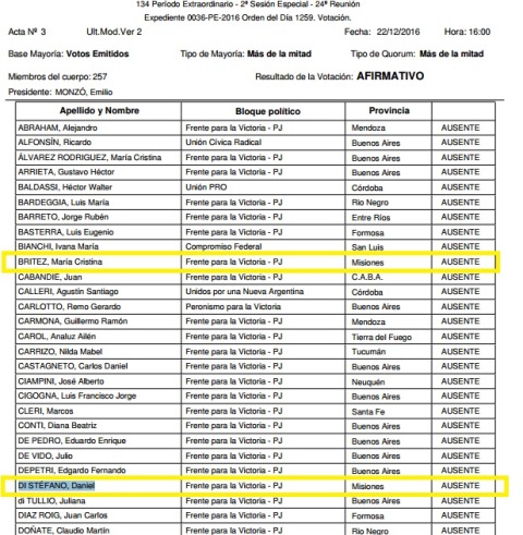 BUENOS AIRES. Los diputados nacionales misioneros Daniel Di Stefano y María Britez del Frente para la Victoria, como era de esperarse, estuvieron ausentes en la sesión de la Cámara Baja a la hora de votar el proyecto de modificación del impuesto a las ganancias que eleva el mínimo no imponible a 37.000 pesos brutos para casados con dos hijos, y a 27.941 pesos brutos para solteros.