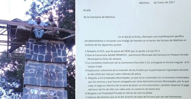En la exposición que realizó ante el Jefe de la Comisaría de Mártires, Cabrera pide que la camioneta municipal marca Nissan Frontier permanezca los fin de semana, y que la S10 sea restituida al municipio ya que fue entregada a un particular. Además pide que el intendente explique el destino de los fondos municipales y el destino de las tejas del acceso que no están. Por último responsabiliza al intendente Armando Sosa de su seguridad e integridad como así también de su familia.