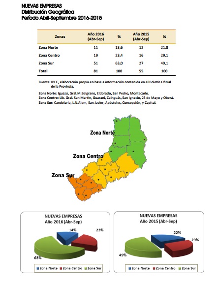 De este informe se desprende que, pese a la crisis económica del 2016, se crearon más empresas que en el 2015 en el periodo de abril a septiembre, la mayor parte concentrada en la franja sur donde se encuentra la ciudad de Posadas con 51 empresas, contra 27 el año anterior.
