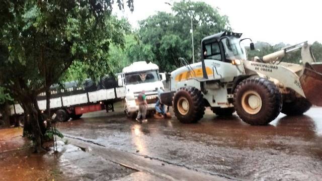 OBERA. Ocurrió pasada las 9 de esta mañana, bajo una intensa lluvia, un camión semi cargado de la empresa “Maderas Don Carlos” se quedó cuando iba subiendo el empinado cerro de la avenida Sarmiento, a metros del colegio Nacional y se desplazó marcha atrás atravesándose en la avenida.