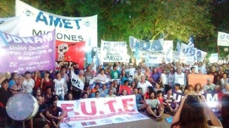 A los cinco gremios que componen FUTE, se sumaron en el reclamo los gremios UDA, SADOP y AMET. Promediando las 18.30, la plaza lucía repleta de trabajadores de la educación provenientes de distintos puntos de la provincia, en una jornada marcada por la lucha docente a nivel nacional que tuvo su mayor pico en Buenos Aires, con una movilización que concentró a más de 400 mil personas.
