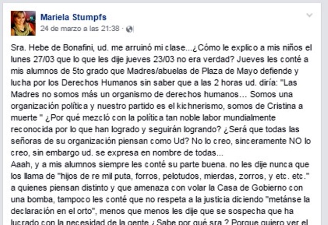 «Sra. Hebe de Bonafini, ud. me arruinó mi clase…¿Cómo le explico a mis niños el lunes 27/03 que lo que les dije jueves 23/03 no era verdad? Jueves les conté a mis alumnos de 5to grado que Madres/abuelas de Plaza de Mayo defiende y lucha por los Derechos Humanos sin saber que a las 2 horas ud. diría: «Las Madres no somos más un organismo de derechos humanos… Somos una organización política y nuestro partido es el kichnerismo, somos de Cristina a muerte » ¿Por qué mezcló con la política tan noble labor mundialmente reconocida por lo que han logrado y seguirán logrando? ¿Será que todas las señoras de su organización piensan como Ud? No lo creo, sinceramente NO lo creo, sin embargo ud. se expresa en nombre de todas…