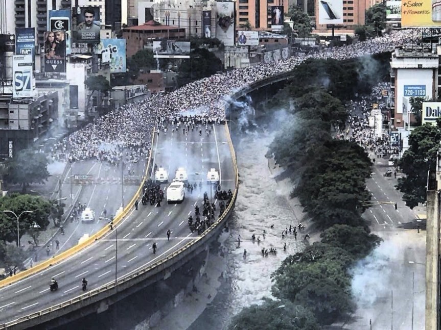 Una de las mayores concentraciones opositoras en Caracas partió desde la plaza Altamira, en el municipio Chacao, y con varios dirigentes a la cabeza se movilizó por la autopista Francisco Fajardo con el objeto de llegar a la Defensoría del Pueblo, pero encontró un cordón de policías que le arrojó gases lacrimógenos.