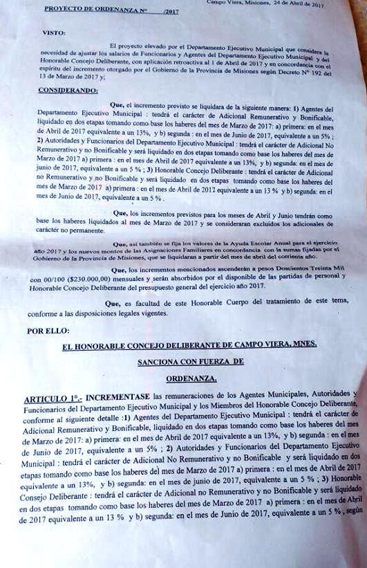 CAMPO VIERA. Tras una acalorada discusión en el Concejo Deliberante, se logró un acuerdo de aumento del 18 % en dos etapas.