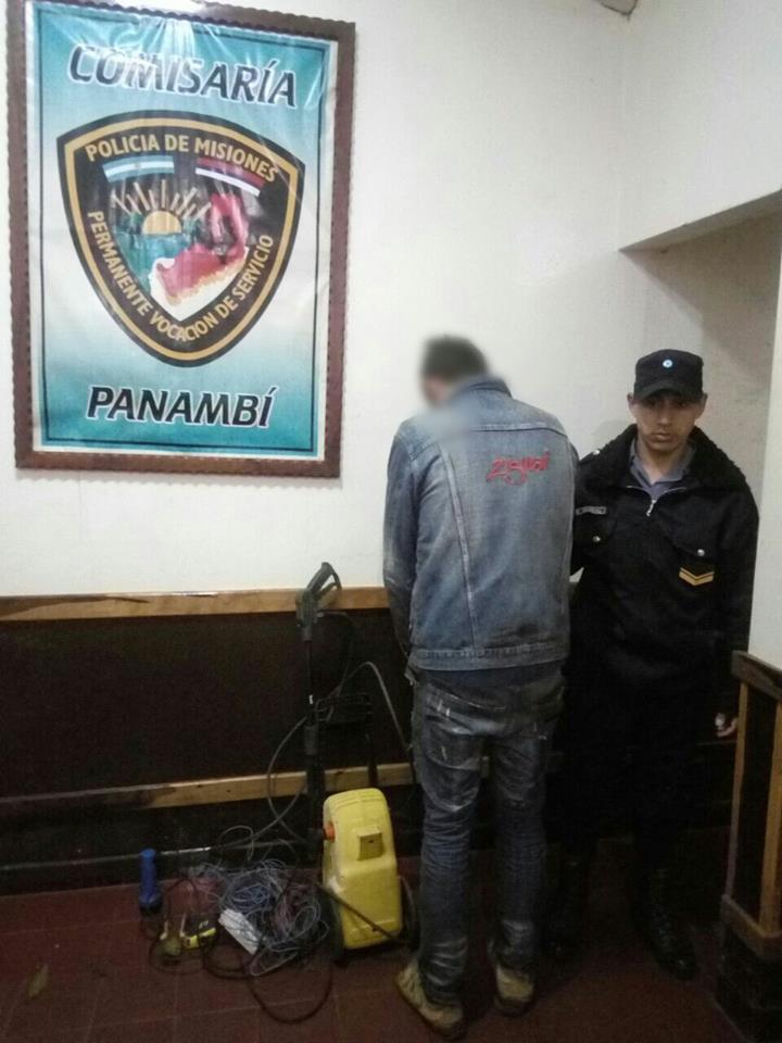 La Comisaria de Panambi, dependiente de la Unidad Regional II, en una rápida tarea de investigación, detuvo ésta madrugada a Matías D.S (19) y demoró a un adolescente de 16 años. Asimismo en poder de los mismos secuestró una hidrolavadora, entre otros elementos que fueron denunciados como robados el pasado viernes.