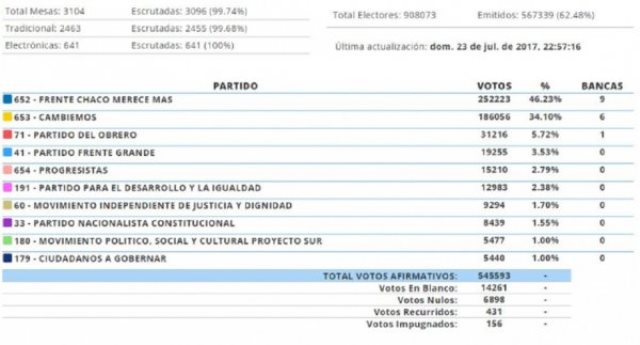Con el 99,74 por ciento de las mesas escrutadas, la lista del PJ, que respaldaron el gobernador Domingo Peppo y el exjefe de Gabinete y actual intendente de Resistencia, Jorge Capitanich, reunía el 46,23 por ciento de los votos, seguido por Cambiemos con una cosecha de 34,10 por ciento de los sufragios y en tercer lugar se ubicaba el Partido Obrero, con el 5,72 por ciento.