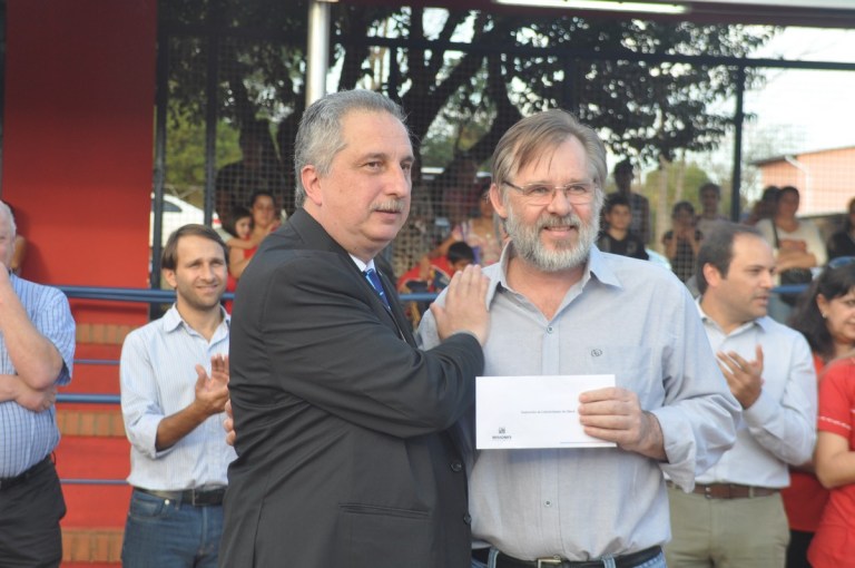 OBERA. En la tarde de este martes 25 de julio, en oportunidad de realizarse el acto de inauguración del nuevo edificio de la Escuela provincial 237 de Barrio Norte, el presidente de Federación de Colectividades, Juan René Hultgren, recibió de manos del gobernador de la provincia de Misiones, Lic. Hugo Mario Passalacqua un subsidio por 800 mil pesos que será destinado pura y exclusivamente para la contratación de artistas para la XXXVIII edición de la Fiesta Nacional del Inmigrante.