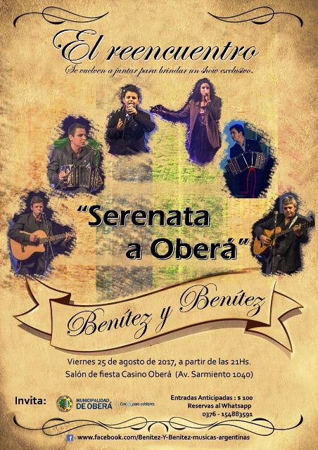 OBERA. Es el que ofrecerán los Benítez y Benítez, el viernes 25 de agosto a partir de las 21 horas, en el salón de eventos del Casino de Oberá, presentando el show “El Reencuentro – Serenata a Oberá”.