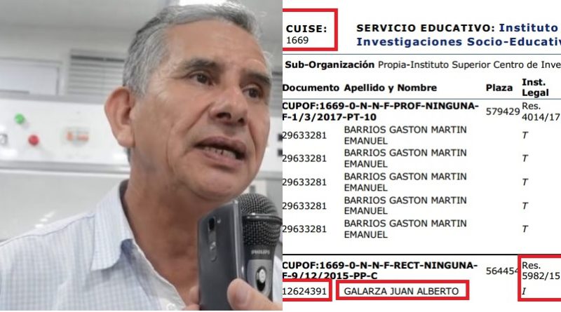 Luego del escándalo por el caso de Flavia Morales, actual titular de la Escuela de Robótica de esa ciudad, se conoció que Alberto “Colita” Galarza, un reconocido funcionario del Consejo General de Educación, también es otro de los ‘beneficiados’ por el gobierno educativo que cobra sin estar frente a un aula. Galarza aparece en la planta funcional de un instituto fantasma, identificado con el CUISE 1669. Según una denuncia de dirigentes del Frente Gremial Docente, el CGE le creó a Galarza y su séquito, una escuela virtual para que cobren horas superiores de educación, con haberes cinco veces por encima de lo que cobra un maestro de grado.