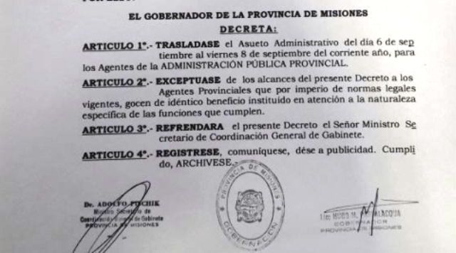 El instrumento legal indica en su articulado: «Trasládase el Asueto Administrativo del día 6 de septiembre al viernes 8 de septiembre del corriente año, para los Agentes de la Administración Pública Provincial».