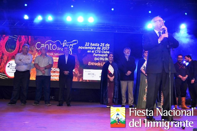 OBERA. En el marco de la 3a noche de la Fiesta Nacional del Inmigrante, se llevó a cabo el lanzamiento de la Expo ijuí Fenadi y del Festival Canto de Luz, que organizan los hermanos brasileños. El presidente de Federación de Colectividades, Juan Hultgren, la Reina Erika Bohn y las princesas Midori Romero Ogawa y Rocío Nasim, recibieron e intercambiaron presentes con la delegación que engalana nuestra fiesta, acompañados por el intendente a cargo Ariel Chaves Rossberg y otras autoridades. Encabezan la delegación brasileña, el presidente del Festival Canto de Luz, Vinicius Hoch; el coordinador Cultural Francisco Roloff, y el Prefeito de Ijuí, Valdir Heck.