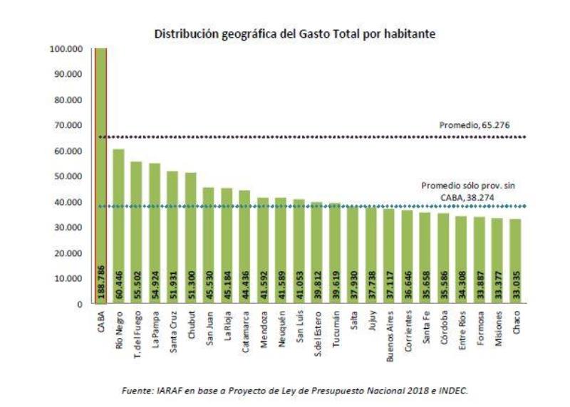 Si se toma el promedio del gasto por habitante proyectado con asignación en provincias, el ordenamiento provincial es muy diferente. En este caso, el ordenamiento del gasto por habitante muestra que en CABA se asignan gran parte de los gastos del nivel nacional del gobierno, cuestión lógica por constituir la capital del país donde funcionan la mayoría de las dependencias federales.