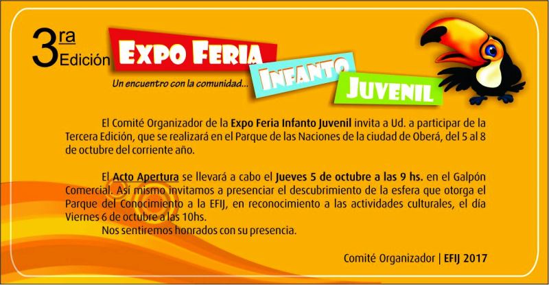 La 3º edición del a Expo Feria Infanto Juvenil será en homenaje al titiritero argentino Javier Villafañe y su «Carreta Andariega»tendrá diferentes atractivos para los visitantes, con entrada libre y gratuita, podrán disfrutar de obras de teatro, charlas para niños, música, stands interactivos del Parque del Conocimiento, Ministerio de Educación, Facultad de Arte y Diseño y la Municipalidad de Oberá, entre otras instituciones.