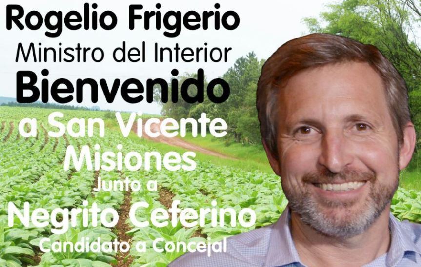SAN VICENTE. El ministro del Interior de la Nación, Rogelio Frigerio, cerrará el acto de campaña el jueves a las 13:30 en el Club Ucraniano de esa localidad misionera. Será un día después que la vicepresidente, Gabriela Michetti haga el cierre en «Salón San Basilio» de calle España y Ucrania en Oberá a las 19 horas. La modalidad sería la misma, con una tarima de 360 º.
