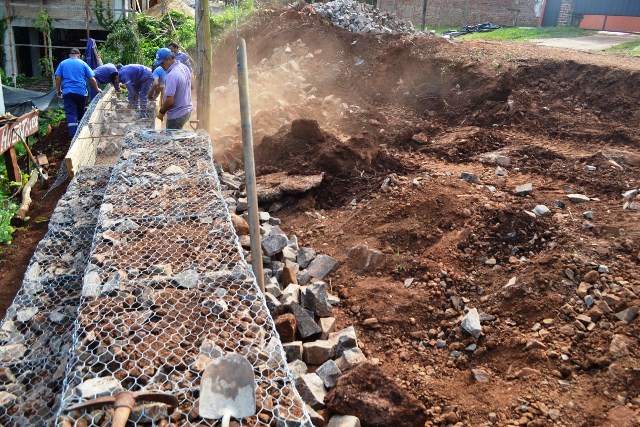 El sector infraestructura, construye un muro de contención sobre calle Saavedra, para el nivelado del suelo, para próximamente realizar el empedrado.
