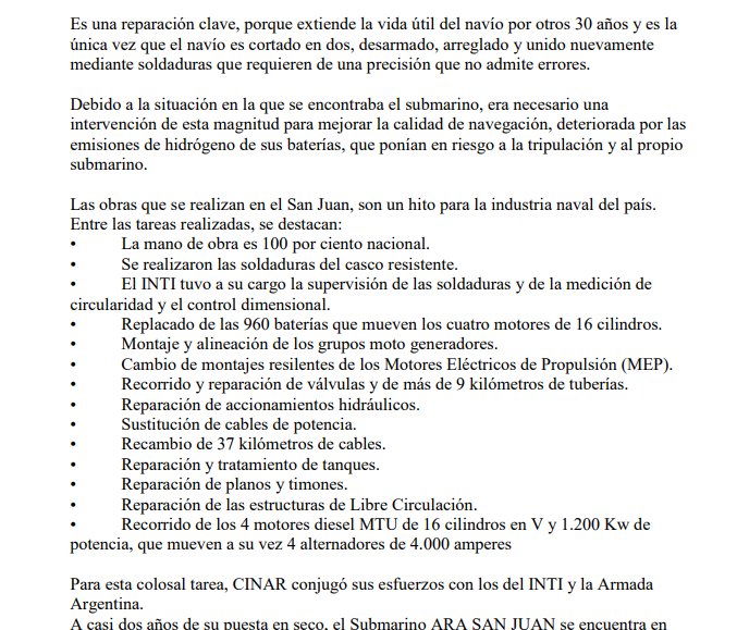 «La reparación de media vida de un submarino, es una de las obras más difíciles y complejas en la industria naval. Cuando se planteó la necesidad de realizar este trabajo en el ARA San Juan , de la Armada Argentina, CINAR creó la gerencia de submarinos, con el objetivo de conformar un equipo especializado para llevar adelante el proyecto, y recuperar capacidades que el país había perdido hacía décadas». Así explica Tandanor en su página web cómo fue el comienzo de la reparación del submarino, que hoy está desaparecido.