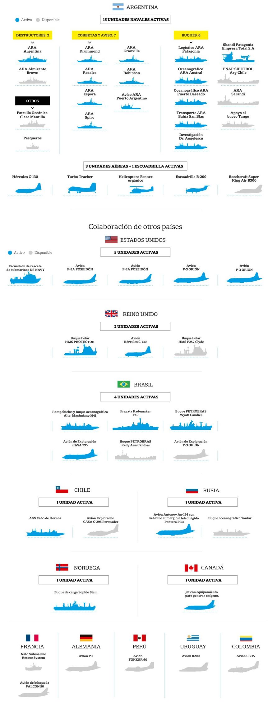 Los buques Cabo de Hornos, HMS Protector, Austral, Atlantis 2 y Skandi Patagonia se encuentran en la zona de búsqueda que se redujo a 74 kilómetros, cuando en un principio eran de 400.000. En las próximas 72 horas se sumarán dos naves rusas a la búsqueda y también la corbeta argentina Robinson, que transportará el minisubmarino ruso Pantera Plus que trajo la imponente aeronave Antonov desde San Petersburgo.
