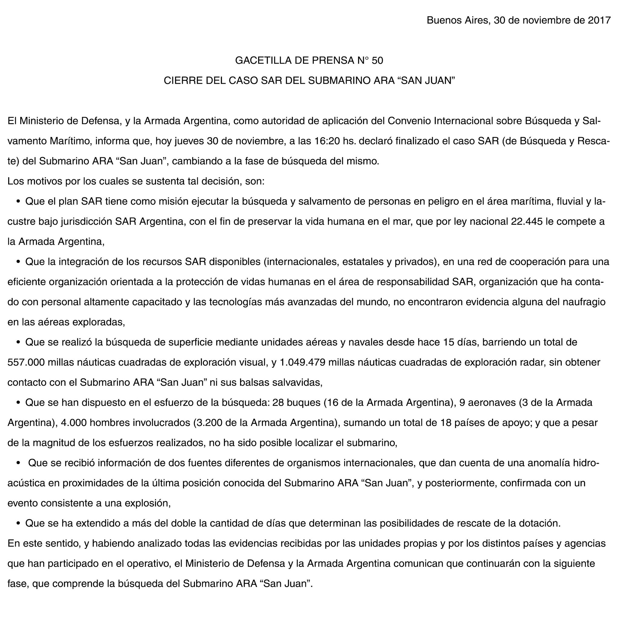 BUENOS AIRES. Lo informó el vocero de la Armada Enrique Balbi en la lectura del parte de este jueves. El operativo de cooperación internacional de búsqueda y rescate denominado SAR SUB para el submarino «ARA San Juan» se dio por finalizado. Seguirán los rastrillajes para dar con los restos del navío en una fase pasiva.