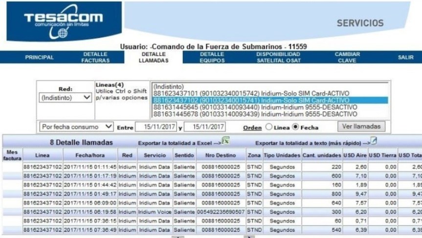 «A las 23.42 del día 14 el submarino hizo una comunicación por voz informando una falla hacia tierra. La siguiente llamada satelital es a la madrugada, donde informa la ubicación. La última llamada por vos es a las 07:19. Con la lista a de Tesacom hay una hora de diferencia, están corridas todas las llamadas. Tesacom hace como si estuviésemos en el huso horario +4, y el que corresponde es el uso +3, según el meridiano de Greenwich», aclaró Balbi.