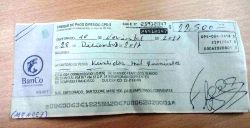 Tras comunicación realizada con la Policía Correntina, se estableció que dichos cheques pertenecían a Francisco D.D, quien denunció en fecha 01 de diciembre, en la comisaria 18° de la ciudad de Empedrado, un robo en modalidad motochorro donde le sustrajeron 98 cheques en blanco.