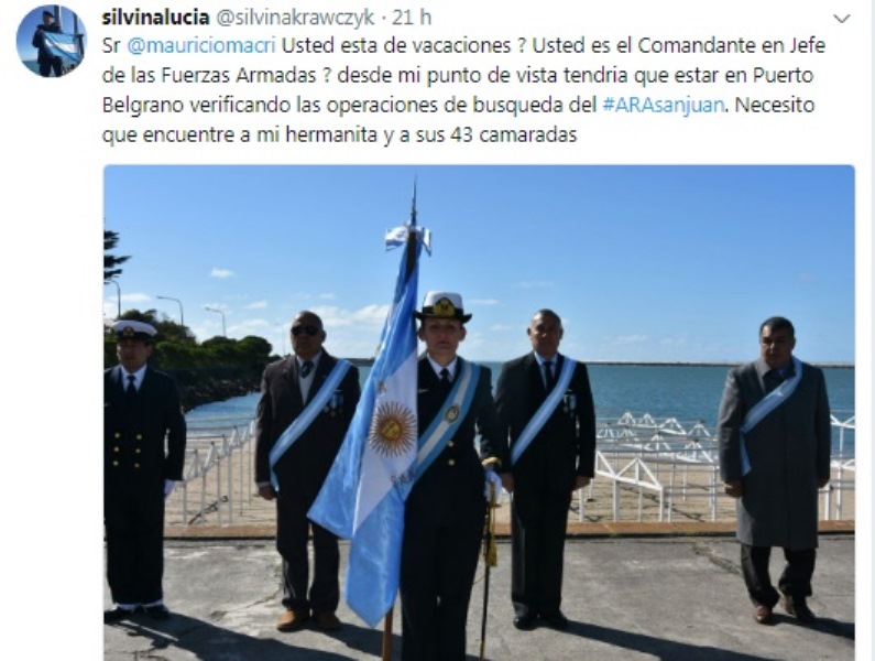BUENOS AIRES. A 24 días de la desaparición del submarino ARA San Juan en el mar argentino con 44 tripulantes, entre ellos la obereña Eliana Krawczyk, su hermana Silvina Lucía reclamó al presidente de la Nación, Mauricio Macri por no ponerse al frente de la búsqueda en Puerto Belgrano y «tomarse» vacaciones durante el fin de semana largo.